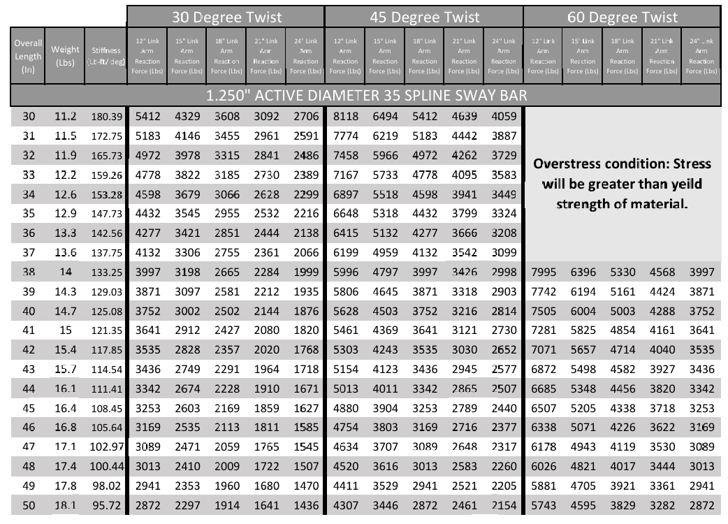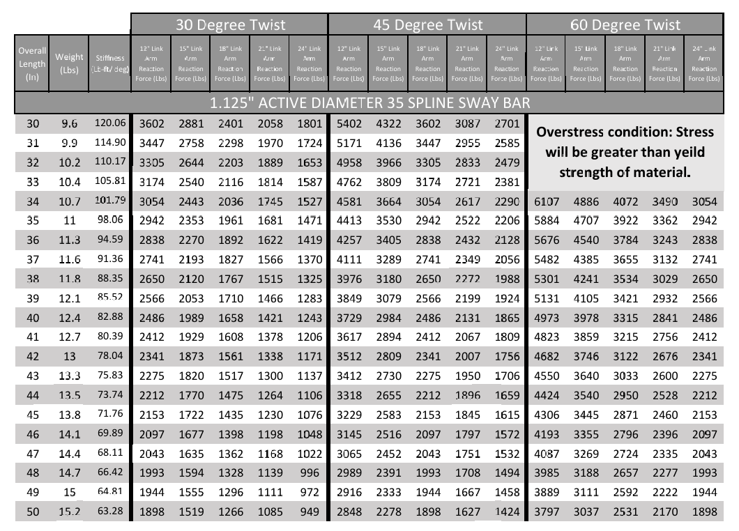 35 Spline Sway Bar Technical Data