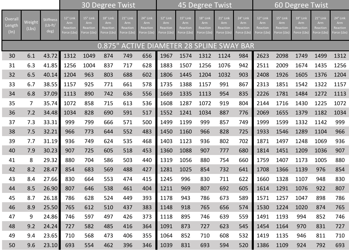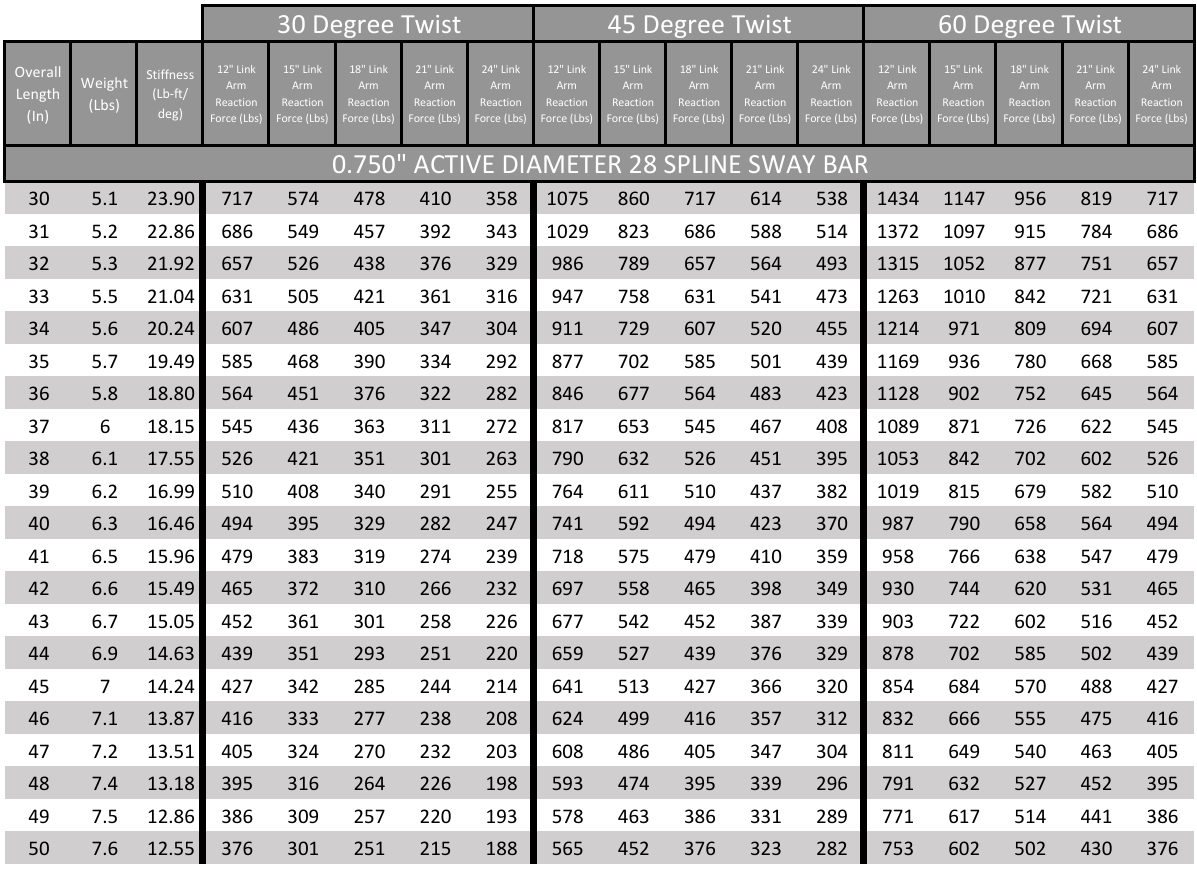 28 Spline Sway Bar Technical Data